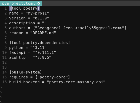poetry는 pyproject.toml파일을 사용하여 프로젝트의 의존성, 패키지 메타데이터 그리고 빌드 시스템을 정의한다.