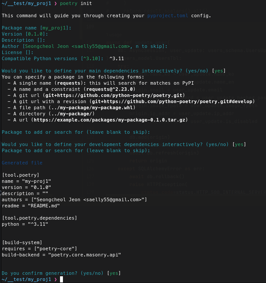 참고로 poetry init을 사용하면 대화 형식으로 패키지를 설치할 수 있다.