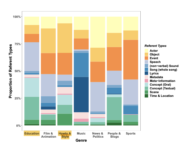 2) visual entities are referenced more often than sounds