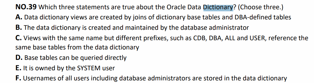 A: 데이터 딕셔너리는 뷰이다. x$로 시작하는 테이블을 조인해서 만든 뷰 ! DBA-defined table로 만든게 아니다.select table_name from dba_tables; ↑ x$table로 조인해서 만든 view!B: dba가 아니라 오라클이 만들고 유지도 오라클이.