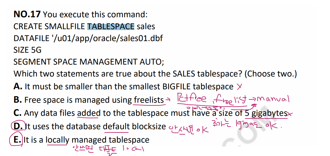 ✅ auto가 아닌 manual은 pct free, pct used, freelist 전부 적어줘야한다.