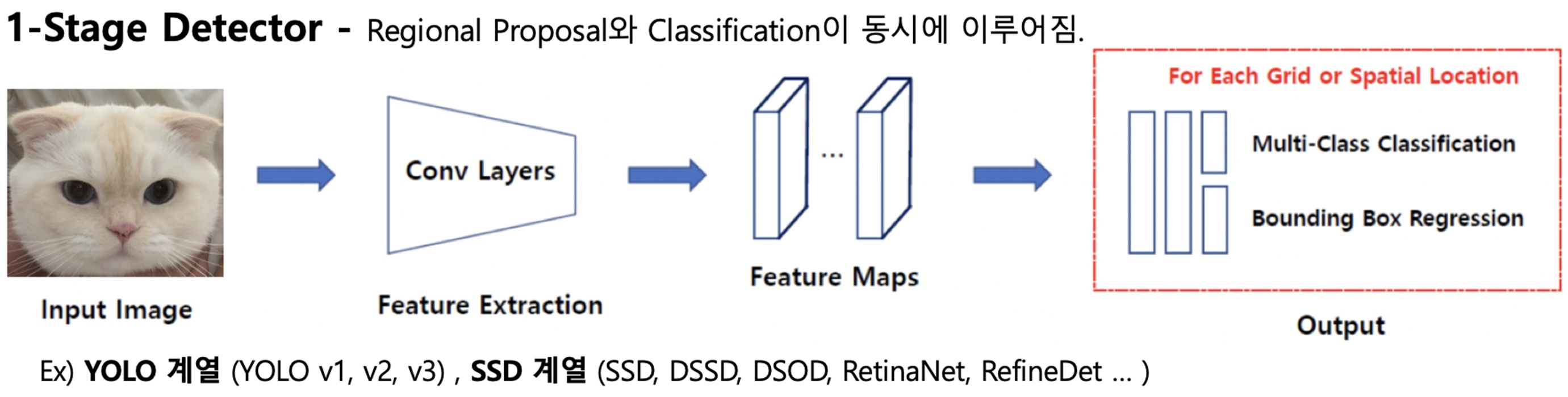 YOLO, SSD (Single Shot Detector), RetinaNet 등이 1-Stage Object Detector에 해당하는 대표적인 예시이다.