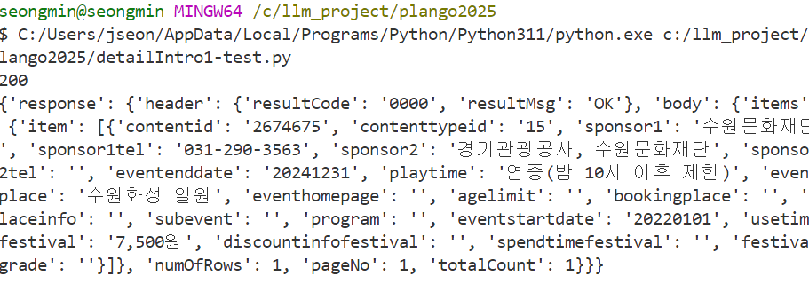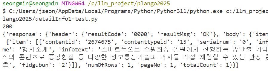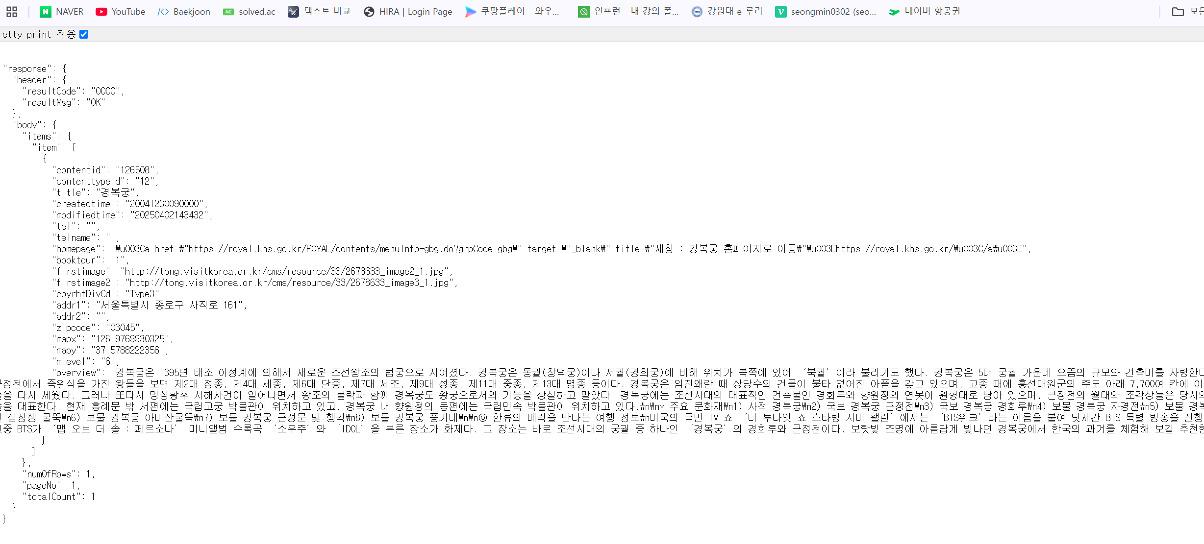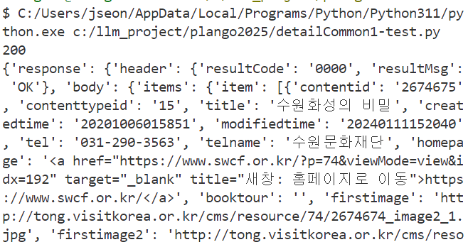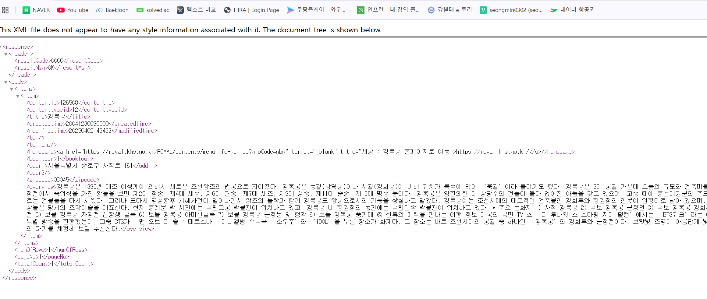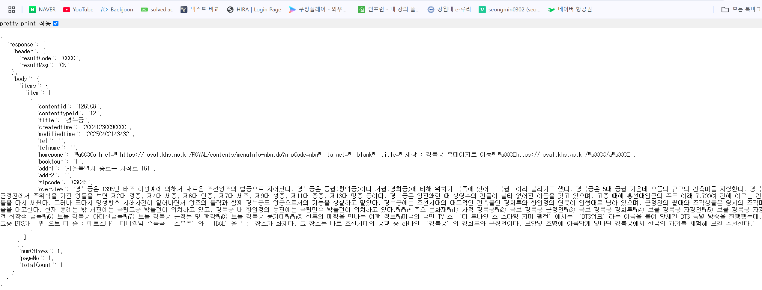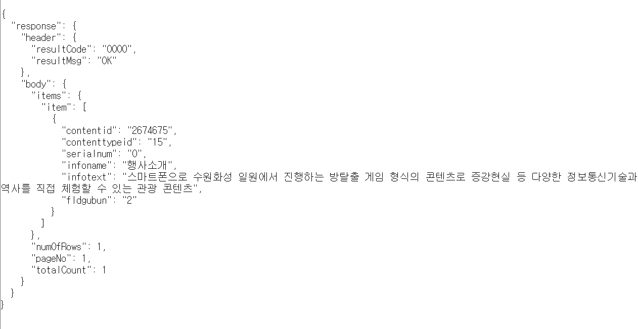 예를들어 컨텐츠ID가 “126508”인 관광정보의 “기본정보”, “주소”, “개요” 정보를 조회하고 싶다면 아래와 같이 요청하면 된다.