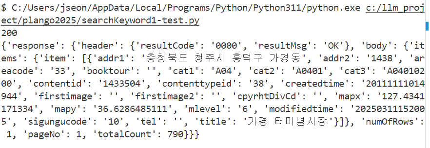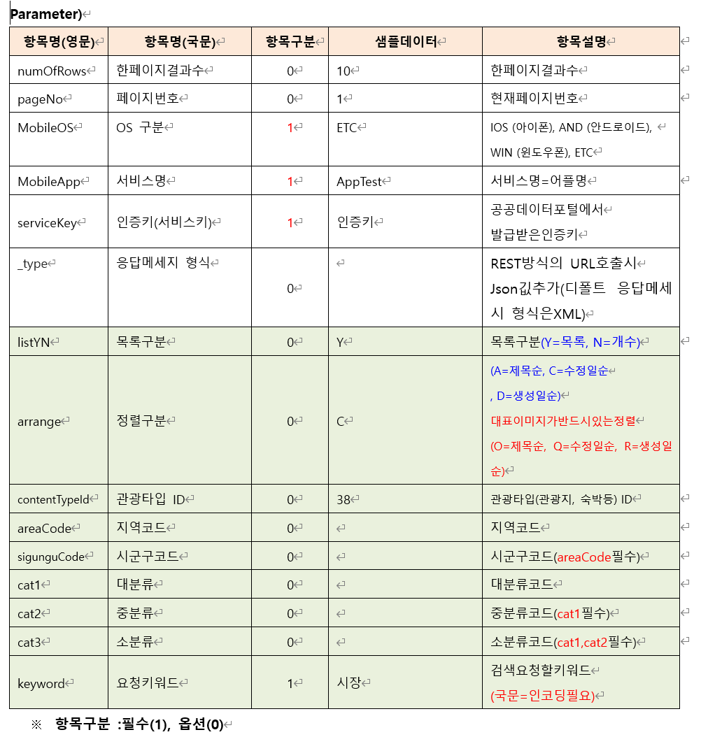 - 특정 지역 내 관광지 리스트 조회 키워드검색조회(searchKeyword1)