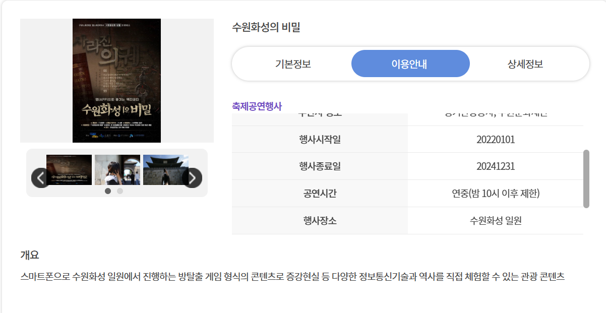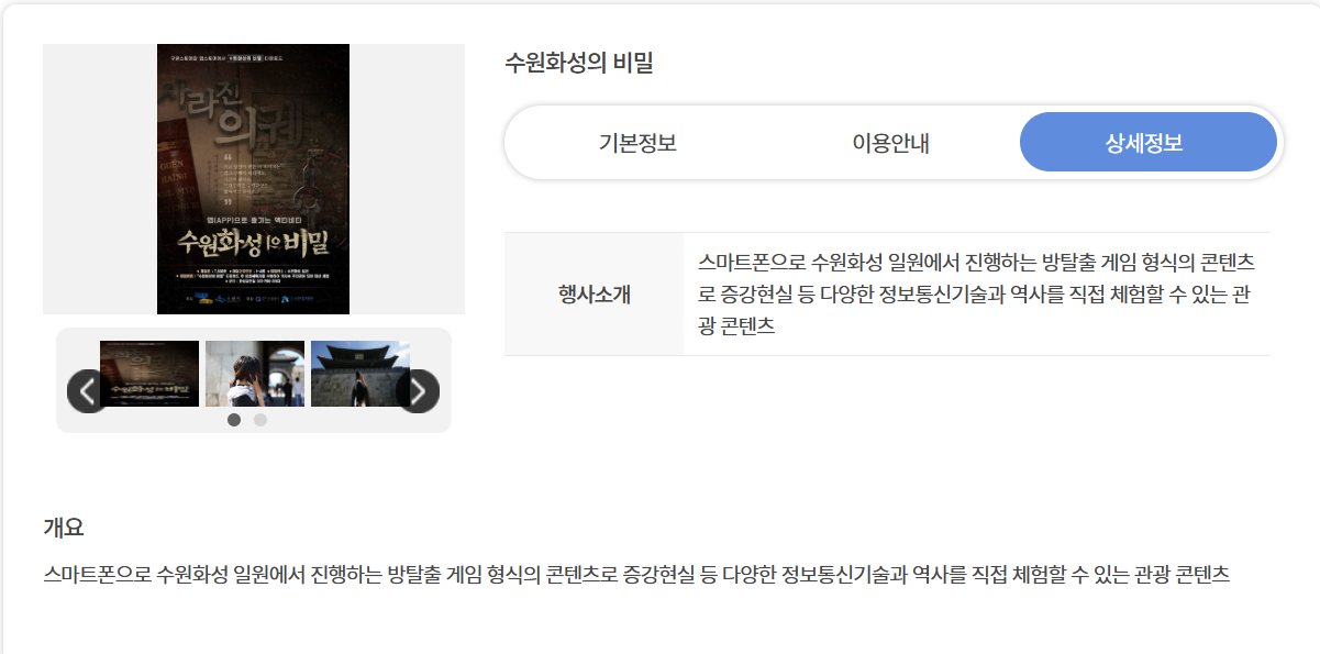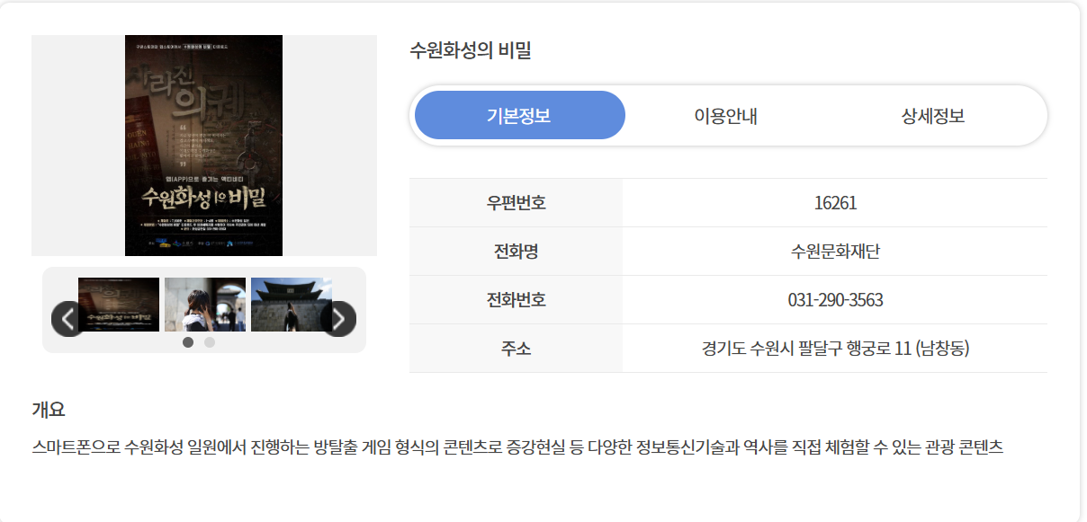 "infotext": "스마트폰으로 수원화성 일원에서 진행하는 방탈출 게임 형식의 콘텐츠로 증강현실 등 다양한 정보통신기술과 역사를 직접 체험할 수 있는 관광 콘텐츠",