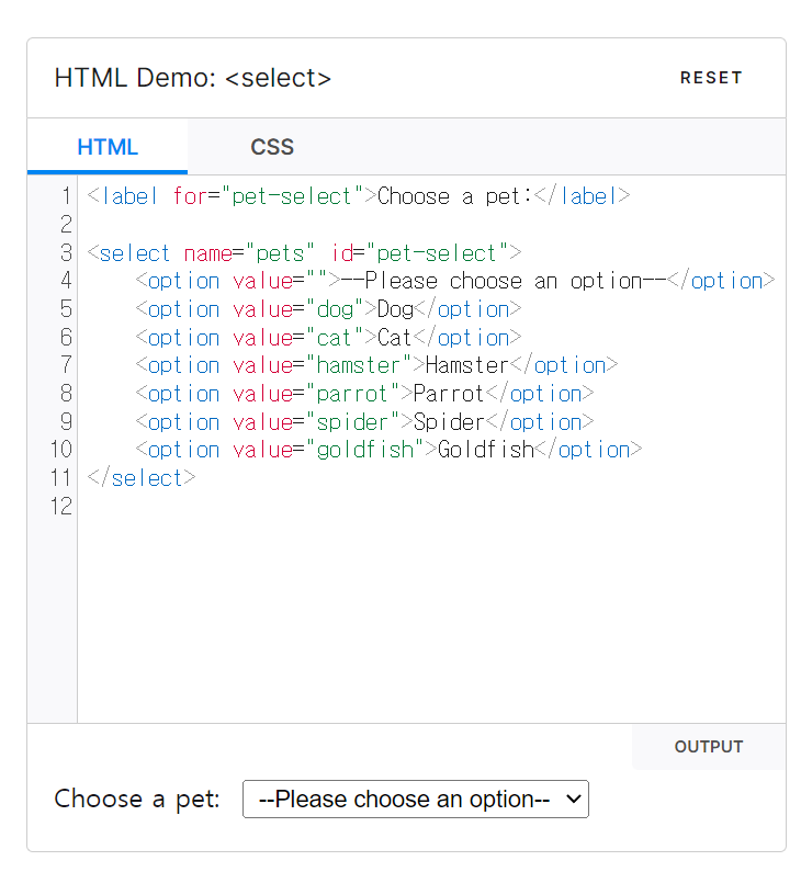 option을 선택할 수 있는 select메뉴가 나온다. 후보군을 option을 통해 넣어줘야 한다.