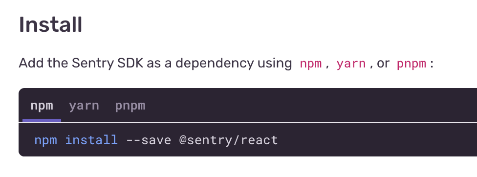 위 사진처럼 자신의 프로젝트 폴더에서 npm install --save @sentry/react를 합니다.