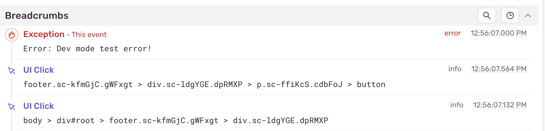 여기선 어떤 동작이 에러를 발생시켰는지 볼 수 있습니다. 문자가 이상하게 나오는 것은 소스맵 문제입니다. 해당 내용도 추후에 추가할 예정입니다.