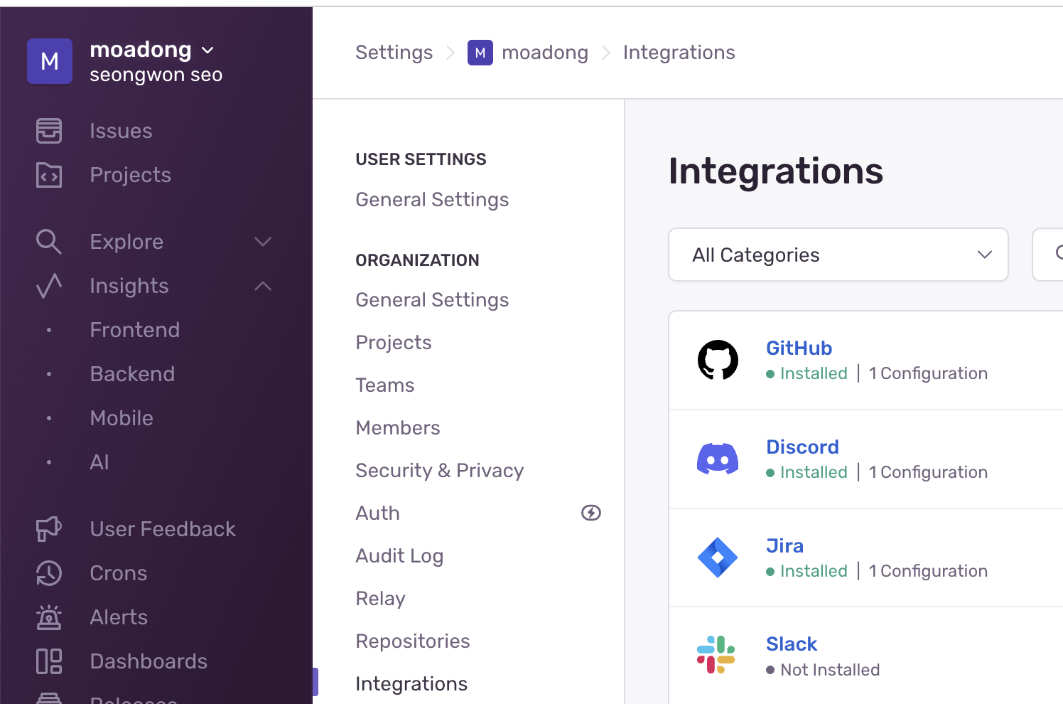 저희 팀은 디스코드와 깃허브를 연동하여 작업 시 활발하게 사용 중이었습니다. sentry에도 웹 훅 연동 기능이 있어서 겸사겸사 연동을 해 보았습니다.
