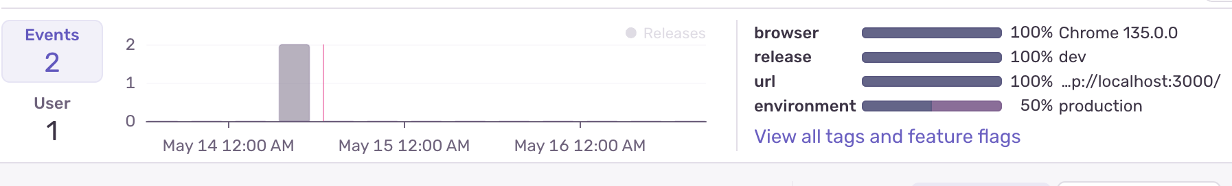 이벤트 수, 유저 수를 보여줍니다. 브라우저 정보, 릴리즈(개발 및 배포 환경), URL, environment(어떤 환경에서 발생했는지) 등을 볼 수 있습니다.