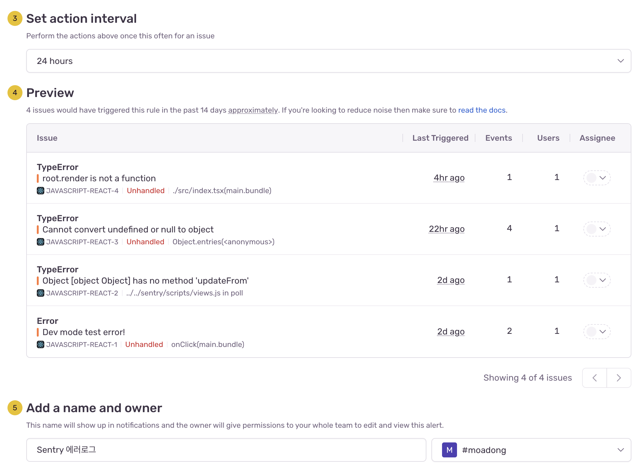 저는 간단하게 이슈 생성 시(에러 발생)에 알람을 주도록 하였습니다.