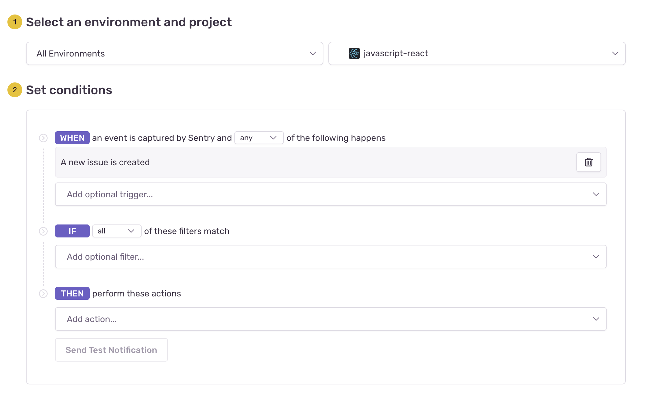 승인이 완료되면 알람 세팅을 할 수 있습니다. 어차피 개발 서버에서 실행되지 않기에 All Environments로 설정해 줍니다.