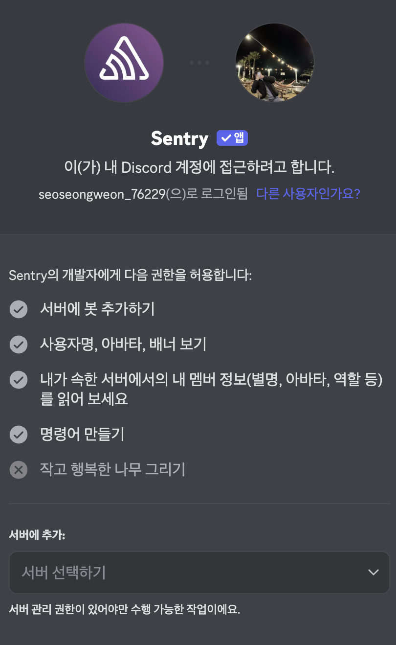 여기서 프로젝트 Discord를 선택하고 승인을 눌러줍니다.