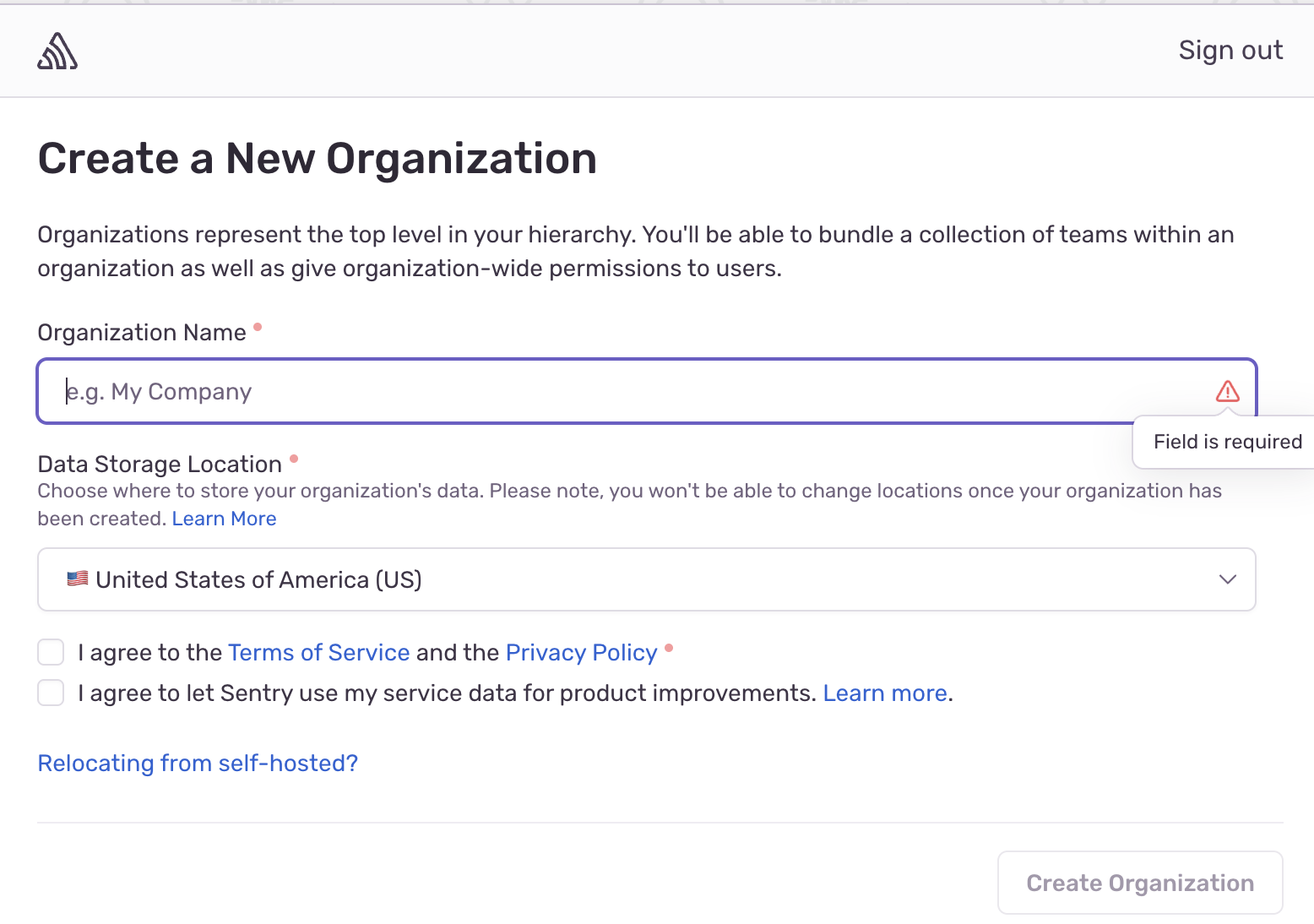 Sentry내에서 쓸 Organization을 만듭니다. 이름은 자유롭게 지어주시면 됩니다.