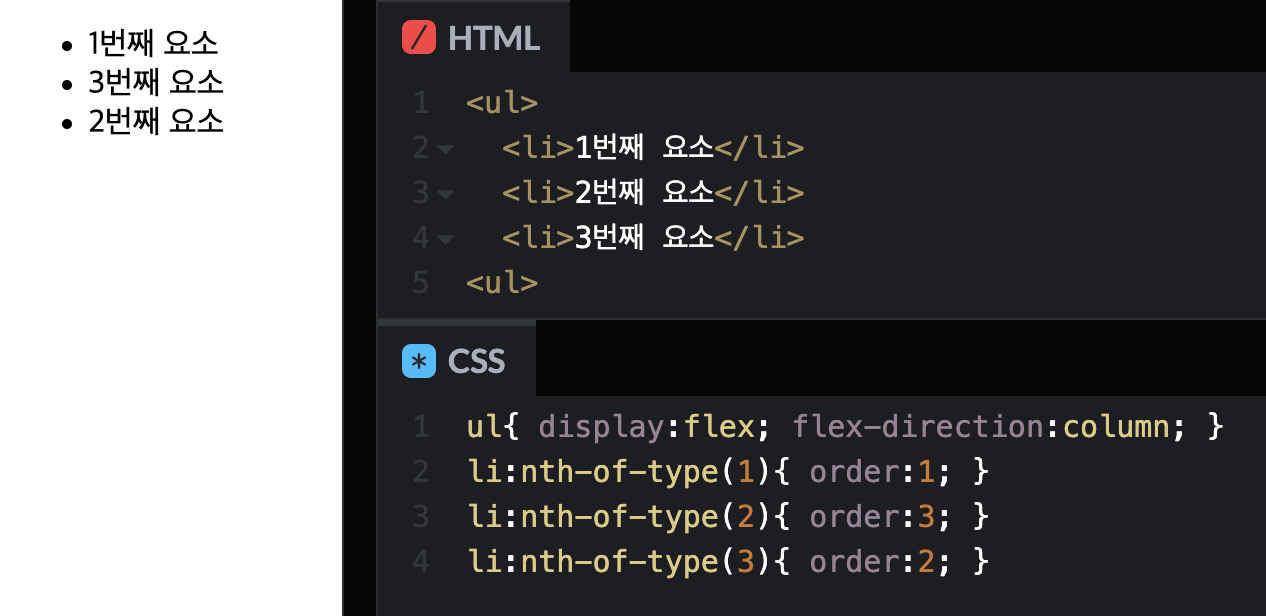 display가 flex인 부모를 가지는 자식 요소들에게 order이라는 속성을 통해 화면에 보여 줄 순서를 조정할 수 있는 것이다. 1부터 차례로 숫자를 지정함으로서 실제 화면에서는 넘버링 한 순서대로 화면에 출력한다.