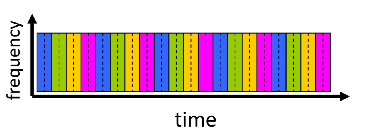 - 모든 주파수대역 사용가능 단, 정해진 슬롯 동안만