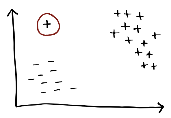 이상치의 예시. 2차원 공간에서 "+"와 "-"로 라벨링이 되어있다. 빨간색 원으로 표시된 "+"만 동떨어진 위치에서 이상치로 표시되어 있다
