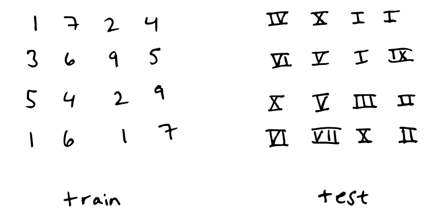 손으로 쓴 숫자 분류 작업에서의 극단적인 분포 변화(특히 공변량 변화/데이터 변화(covariate shift / data shift))의 예시. 분류기는 아라비아 숫자 0–9에 대해 훈련되었으며, 로마 숫자 0–9에 대해 평가. 이는 성능이 극도로 저하될 가능성이 있다