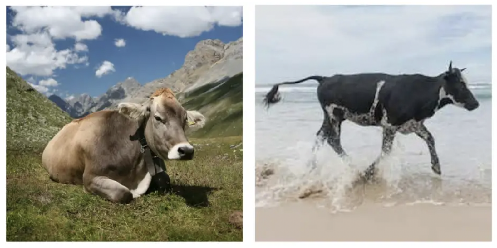 Beery et al. (2018)의 예를 고려해보자. 왼쪽 이미지에서는 훈련된 이미지 분류기가 소가 포함되어 있다고 올바르게 예측하지만, 오른쪽 이미지에서는 동일한 예측을 하지 못한다. 그 이유는 무엇일까?