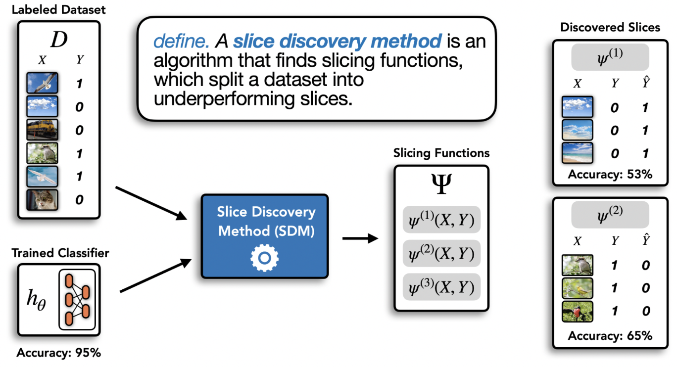 이는 훈련된 모델이 특정 데이터 슬라이스에서 성능이 저조한 사례들이다. 데이터 슬라이스(data slice)는 공통된 특성을 공유하는 데이터셋의 하위 집합을 의미한다. 예를 들어, 특정 센서로 수집된 데이터, 인종, 성별, 사회경제적 지위, 나이, 위치 등 다양한 기준에 따라 슬라이스를 구분할 수 있다. 슬라이스는 데이터의 코호트(cohorts), 하위 집합(subpopulations), 또는 하위 그룹(subgroups)이라고도 불린다.