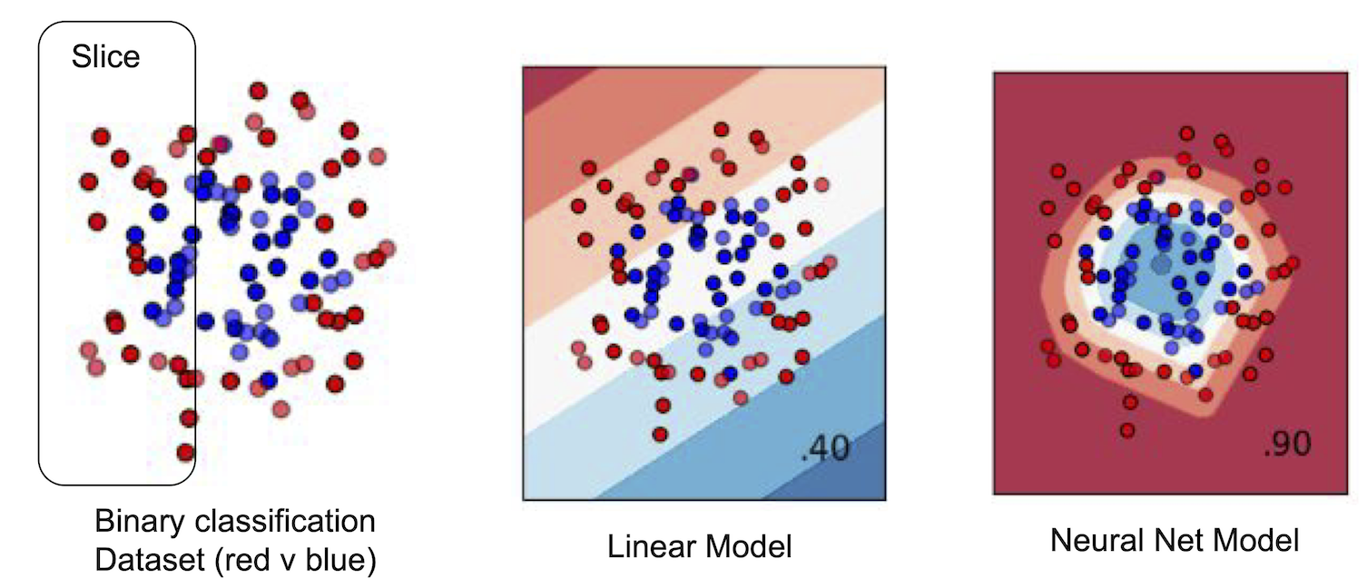 위 그림은 이진 분류 작업에서 선형 모델이 특정 슬라이스 내부와 외부의 데이터에 대해 더 나쁜 예측을 생성하는 상황을 보여준다. 더 유연한 신경망 모델은 이러한 조절 없이 슬라이스 내부와 외부 모두에 대해 정확한 예측을 생성할 수 있다.