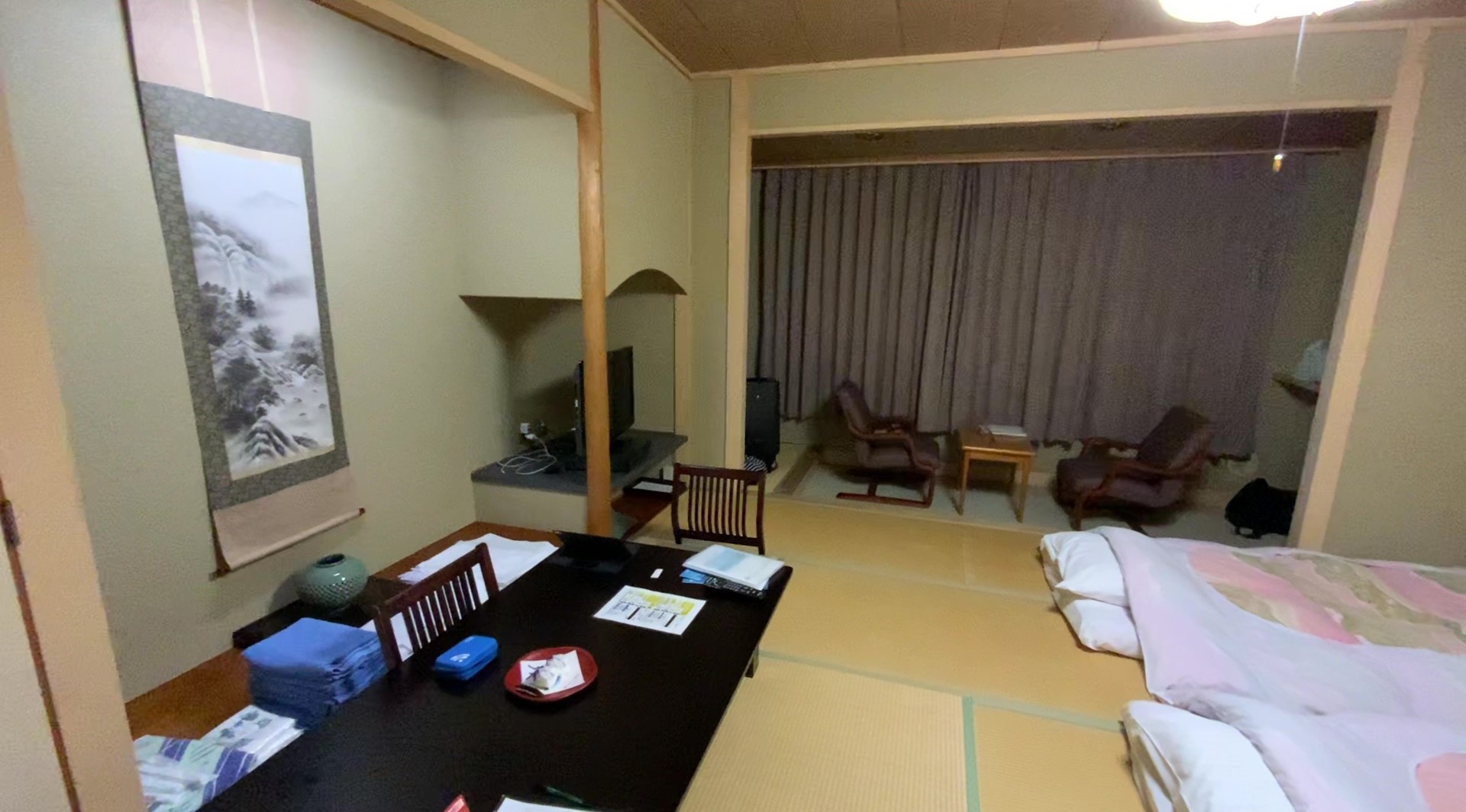 숙소인 미나미센리쿠 호텔 칸요에 도착하자 직원분께서 버스에 올라타 호텔에 대한 자세한 설명과 주의사항을 이야기해주셨다. 다다미방에 유카타를 입고 생활할 수 있는 곳이기에 충격에 약한 다다미를 보호하기 위해 다다미 위에서는 캐리어 바퀴를 끌지 말아달라는 점, 분리수거를 부탁드린다는 점 등 주의할 부분이 많았다. 각 방에는 온천용 수건과 몸을 닦기위한 긴 수건, 유카타가 정리되어 있었다. 콘센트는 어느 정도 있었지만 방 여러 군데에 퍼져있어 바로 파악하긴 힘들기도 했지만, 책에서 읽었던대로 일본식 가정집처럼 세면실과 화장실이 분리되어 있어 신기했다. 다만, 호텔 내부에 와이파이가 있긴 했지만 전파가 잘 터지지 않았고, 특히 개인적으로 지침한 와이파이 도시락 외의 다른 포켓 와이파이의 신호가 약해져 다른 방일단분들이 불편함을 느끼기도 했다.