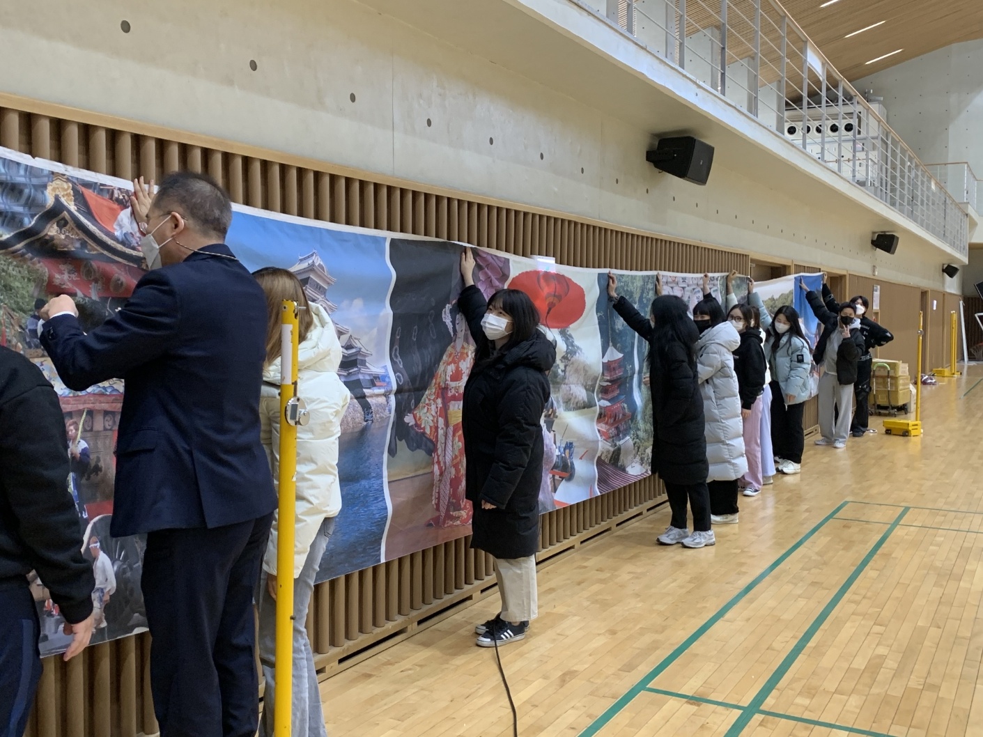 부산외국어대학교 강당에 현수막을 붙이고 있는 서포터즈와 차장님