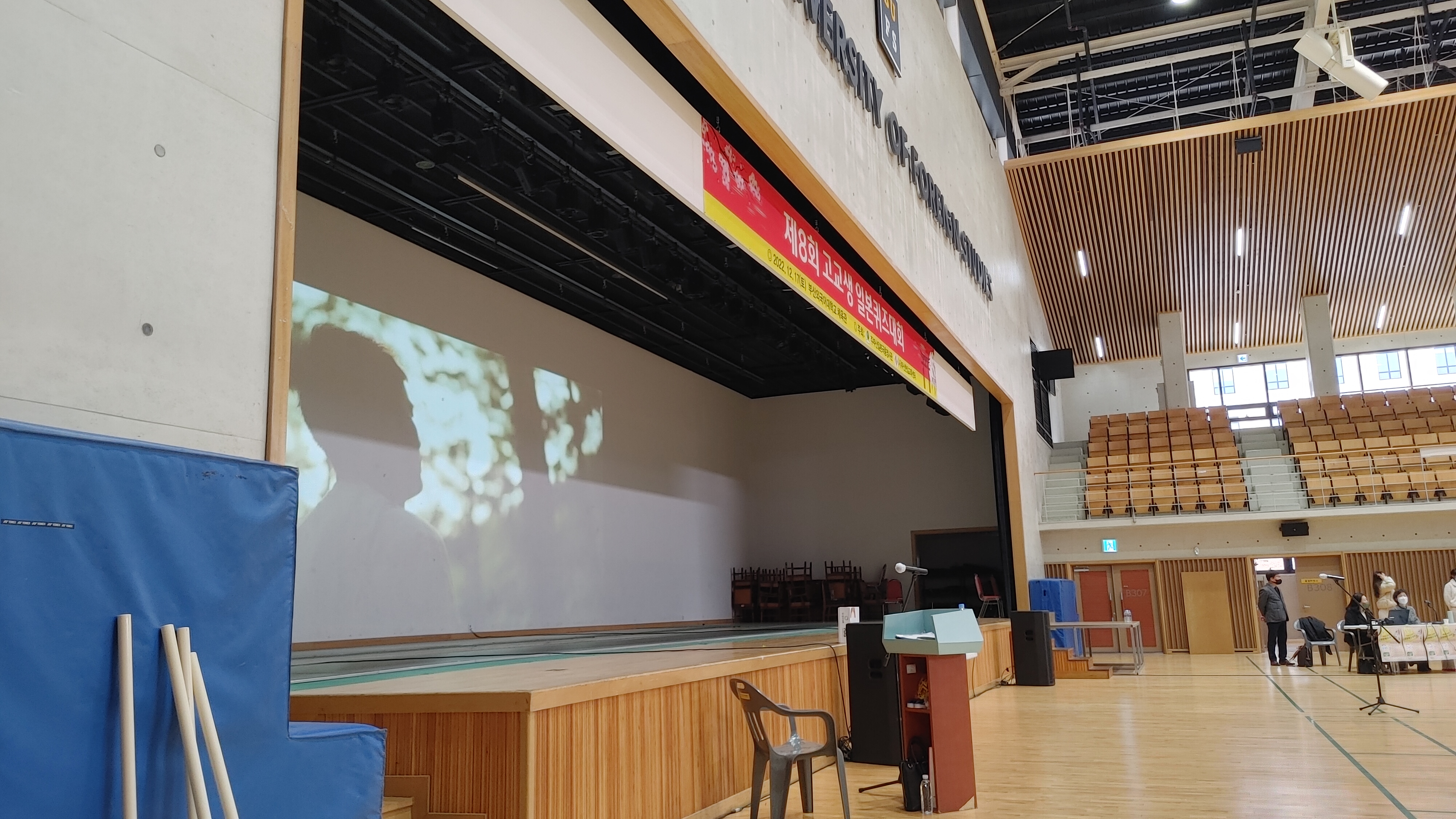 마이크 커버 교체와 강당 중앙 현수막 조정을 위해 대기 중이었던 나와 민욱이