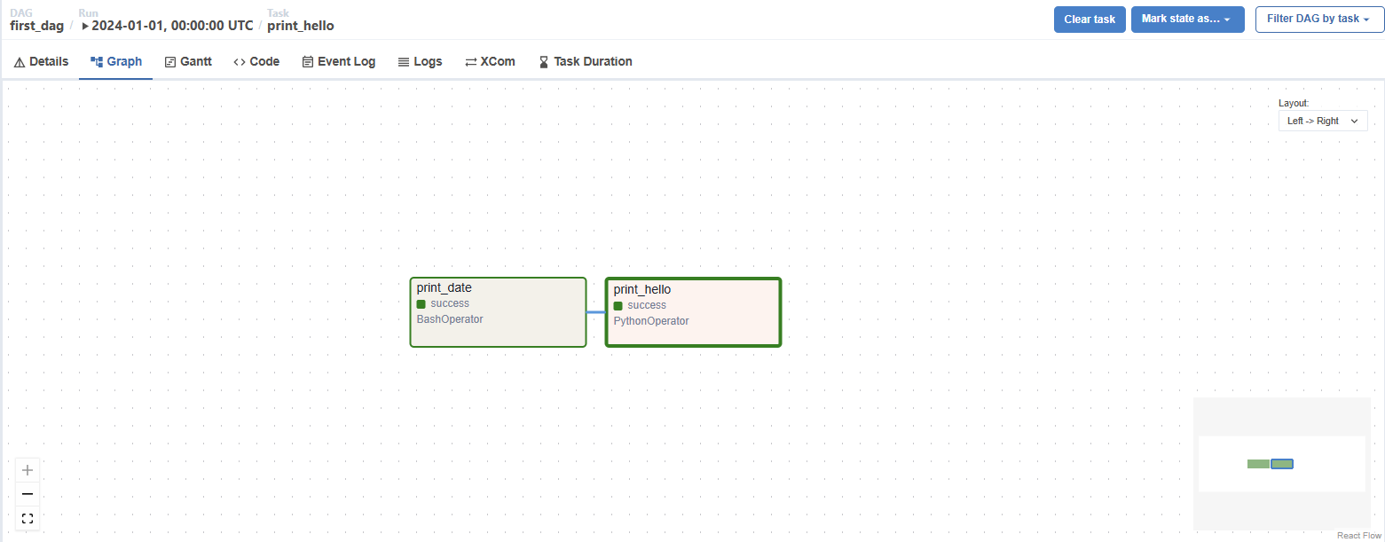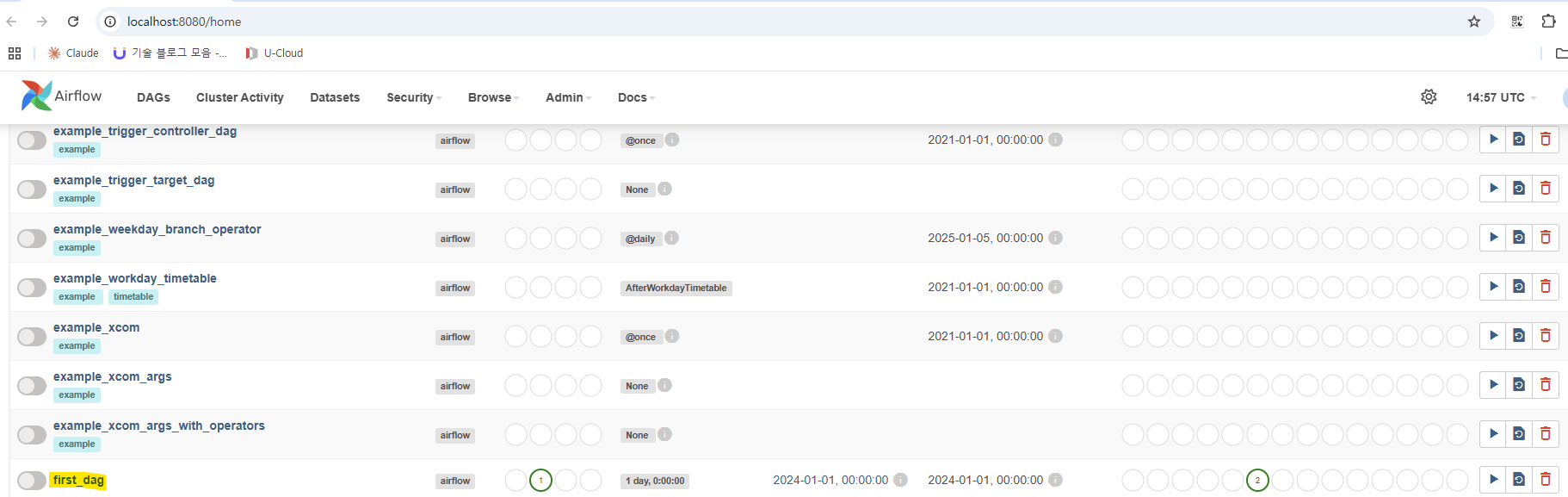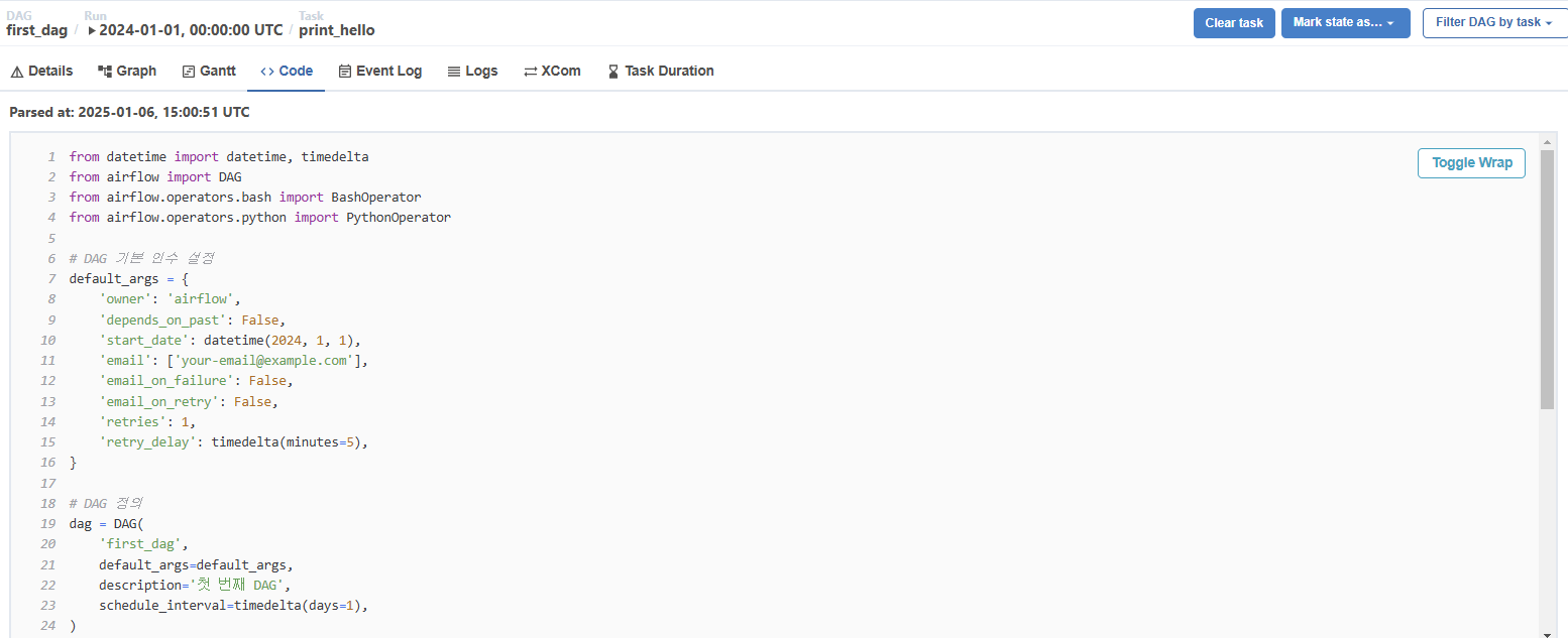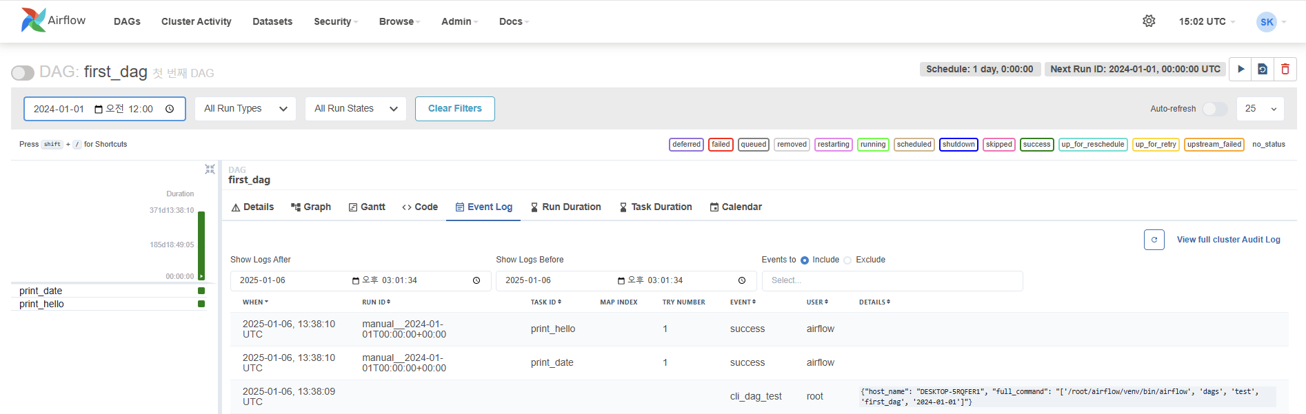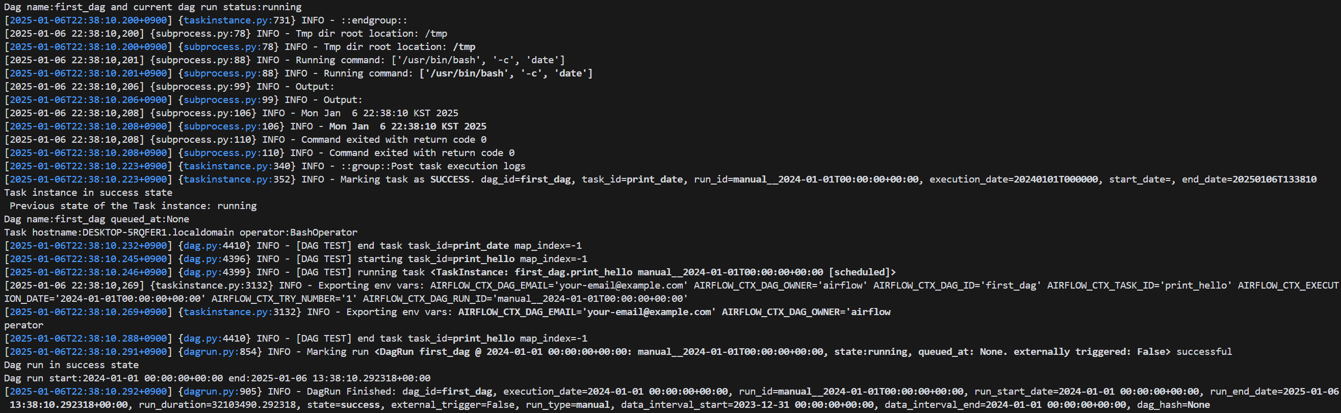 DAG: 작업 흐름을 구성하는 태스크들의 집합DAGs: 작업의 의존성, 실행 순서, 스케줄, 파라미터를 정의하는 파이썬 스크립트 모음. Airflow에서 실행될 워크플로우의 틀 설정Operators: 데이터 추출, 변환, 로드 등 특정 작업을 수행하는 파이썬 클래스. 워크플로우 내에서 단일 작업 또는 일련의 작업의 추상화Tasks: Operator의 인스턴스로, 워크플로우에서 실행될 각 작업 단위의 정의. 독립적 실행 또는 다른 Task와의 연결 가능Schedulers: 설정된 스케줄에 따른 DAG 실행 역할. DAG 주기적 검사, 실행할 Task 트리거, 필요시 재시도 수행Executor: Scheduler에 의해 등록된 Task들의 Worker 할당 및 작업 실행 관리 시스템. 다양한 Executor 유형을 통한 작업 분산 방식 결정Worker: Task의 실제 실행 단위. 독립된 프로세스로 할당된 Task의 병렬 실행 가능Webserver: 웹 기반 사용자 인터페이스. 사용자의 워크플로우 시각적 배포, 모니터링, 수정 가능 플랫폼Airflow.cfg: 전반적인 동작 방식 설정(디렉토리 지정, DB 연결 정보, 보안 설정, 이메일 알림 설정 등)Metadata DB: 저장정보(DAG 실행 기록, 태스크 상태, 변수와 연결 정보, 사용자 정보, 스케줄링 정보) PostgreSQL, MySQL 등 변경 가능wsl --install # PowerShell 관리자 모드에서