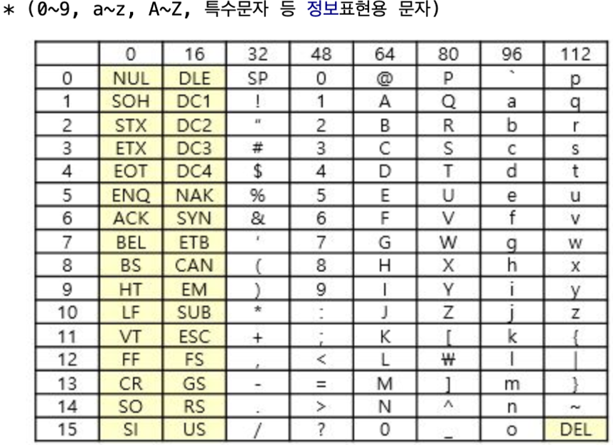 - ASCII코드는 총 128개의 문자를 숫자로 표현할 수 있도록 정의해 놓은 코드
