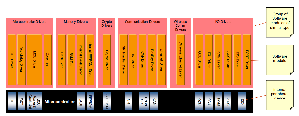 MCAL과 ECU Abstraction Layer 모두 하드웨어를 추상화 하지만, MCAL은 Micom 수준의 하드웨어(ADC, GPIO, PWM) 등을 추상화한다. ECU Abstraction Layer에서는 MCU를 포함하여, ECU 전반에 있는 센서, 엑추에이터와 같은 전반적인 모든 하드웨어를 추상화한다