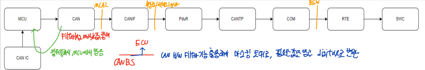 Sensor, Actuator Data가 MCAL -> I/O Hardware Abstraction -> RTE -> SWC 까지 올라가고, 다시 내려가면서 제어를 위한 Acutator 가동