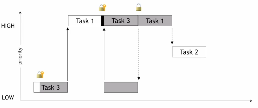 1. T3가 어떤 임계구역(Critical Section)에 들어가서, 테스크 진행 중이다가, 우선순위가 높은 Task1이 Ready가 되어서, 선점하여 태스크1이 작동 됨