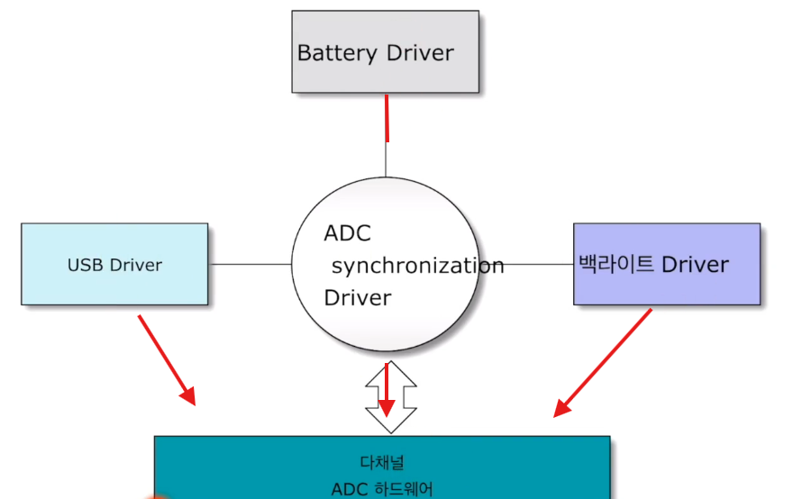 각 상위 디바이스 드라이버가 하위 디바이스 드라이버인 ADC 드라이버를 접근하면서 임계구역이 생긴다