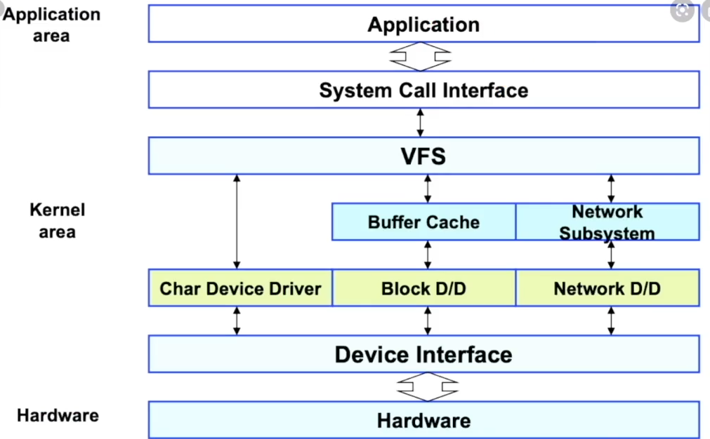 Application에서 일관된 방법으로 호출하면, 내부적으로 VFS에서 각기 다른 디바이스 드라이버를 호출하여 HardWare를 사용한다