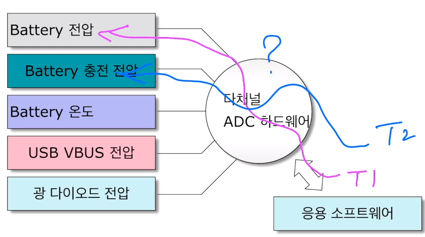 ADC 하드웨어가 T1과 T2에서 서로 다른 목적을 위해 사용된다