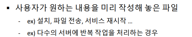 기존 엔서블 모듈로, 연결된 서버에 작업을 했다면, 미리 사용자가 원하는 행동을 작성해놓은 파일을 Ansible Playbook 이라고 한다