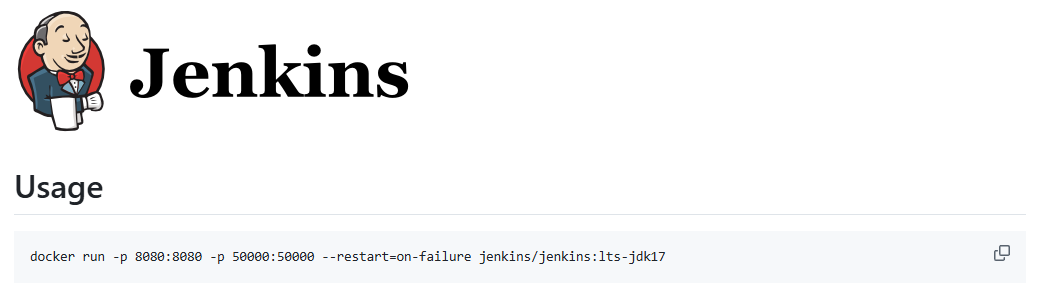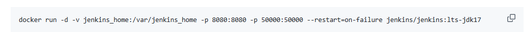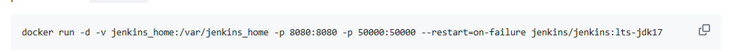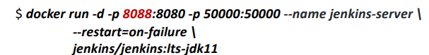 데몬으로 실행할거다, 컨테이너 이름은 jenkins-server, 이미지는 디폴트 레파지토리에, jenkins프로젝트에 jenkins, 테그는 lts-jdk11