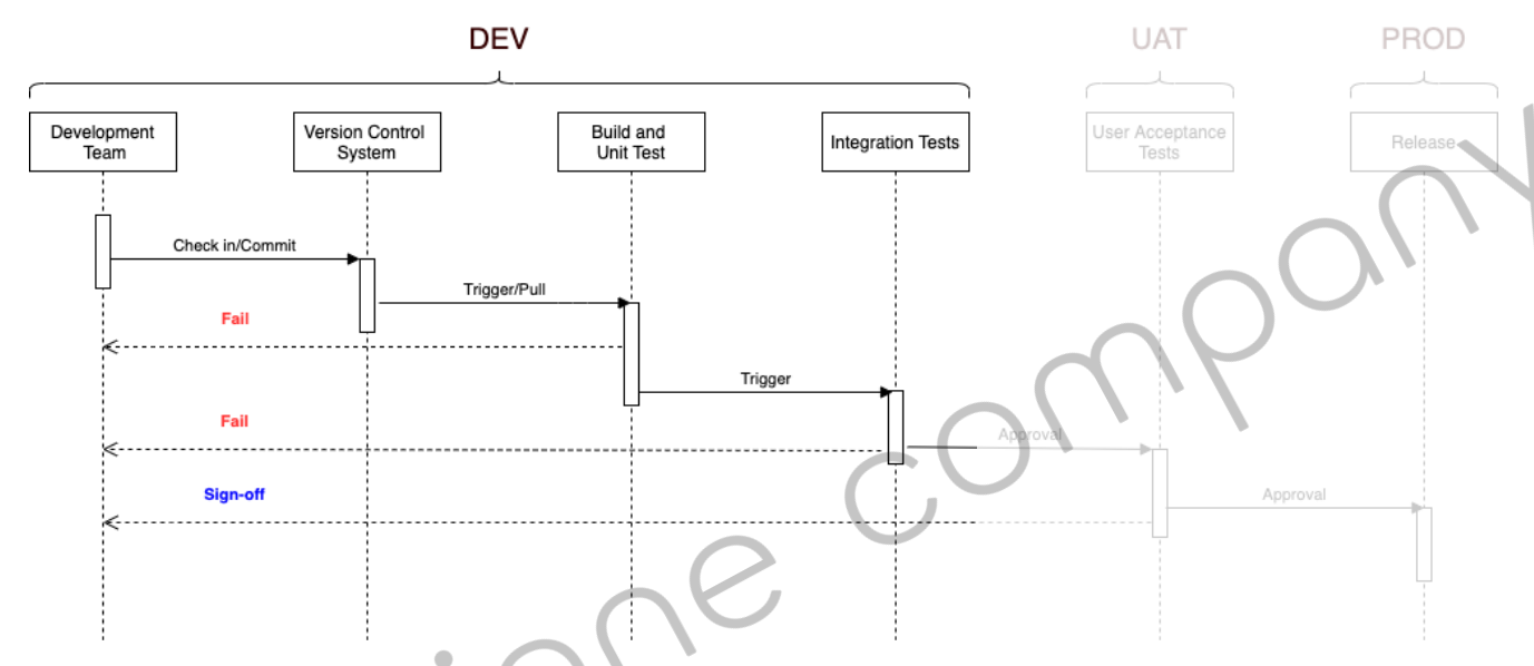 개발 팀에서 코드 개발하고, VCM/SCM에서 코드 저장한 뒤, 개발 환경에서 빌드 후 단위 테스트까지 이루어짐. 이 통합테스트가 끝나야 고객이 테스트하는 UAT로 넘어갈 수 있다. 그 이후 프로덕션으로 넘어간다