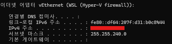 본인은 톰캣을 호스트pc에서 가동 중, 터미널에서 ipconfig 입력 후,