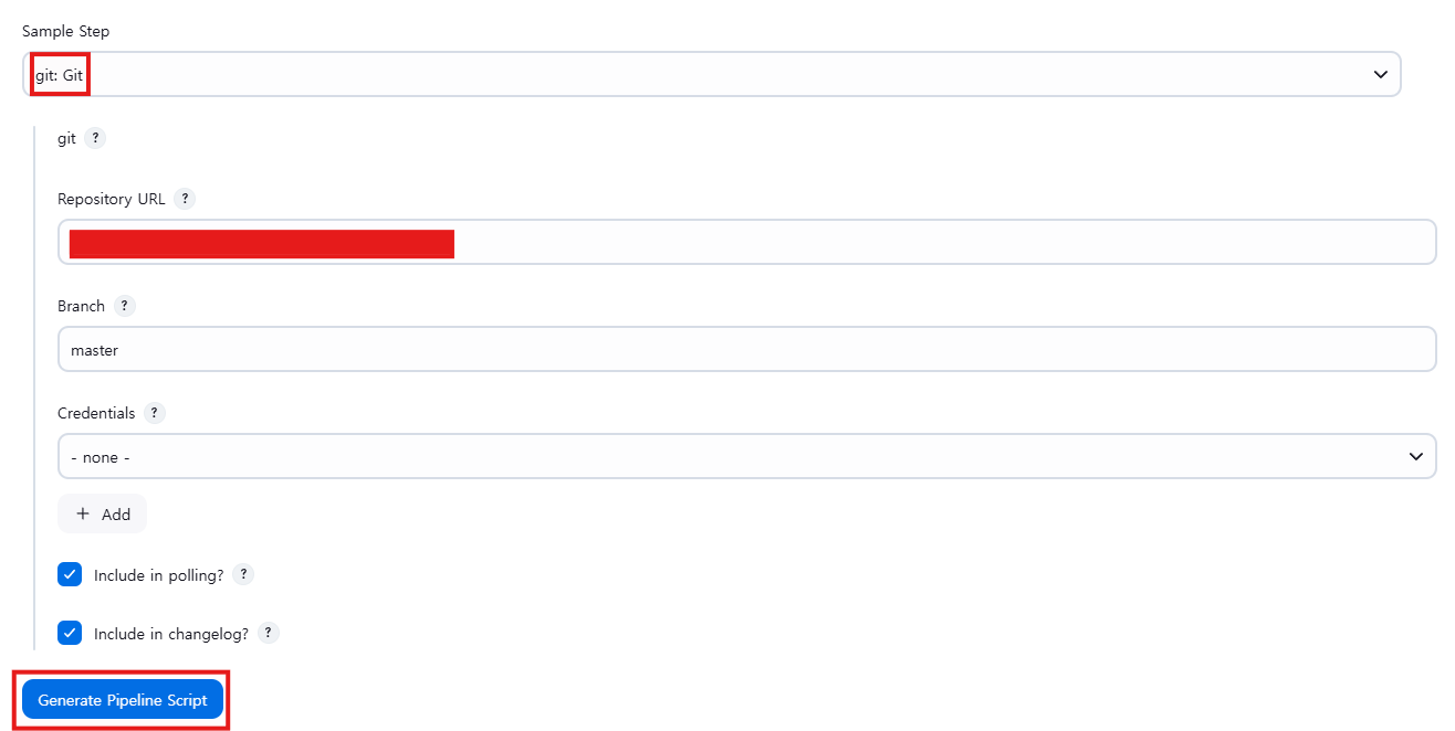 여기 Generate Pipeline Script 누르면, 위의 설정 사용할 수 있는 pipeline syntax 생성된다