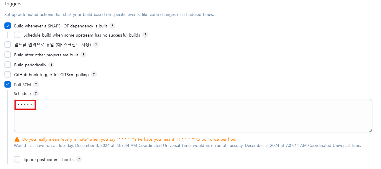 commit에 대한 업데이트가 있을 때만 빌드 -> Poll SCM