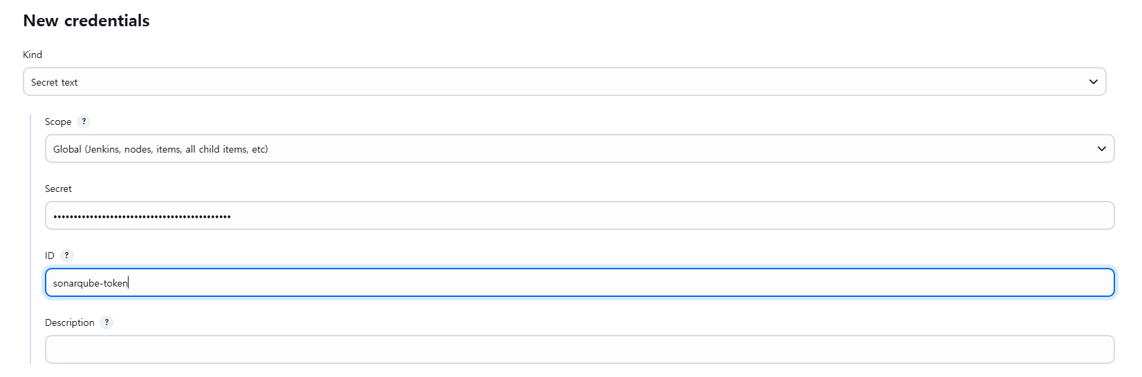 credential 추가, secret에는 sonarqube에서 만든 token 추가하자