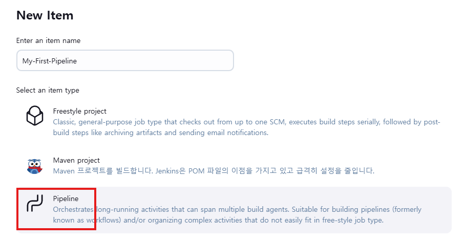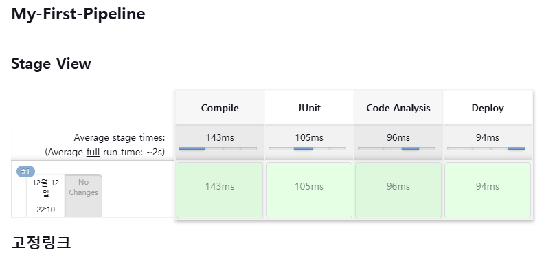 Jenkins가 제공하는, 프로젝트 타입인 파이프라인 만들어서, 각 스테이지를 만들고, 출력 값 확인해봤다