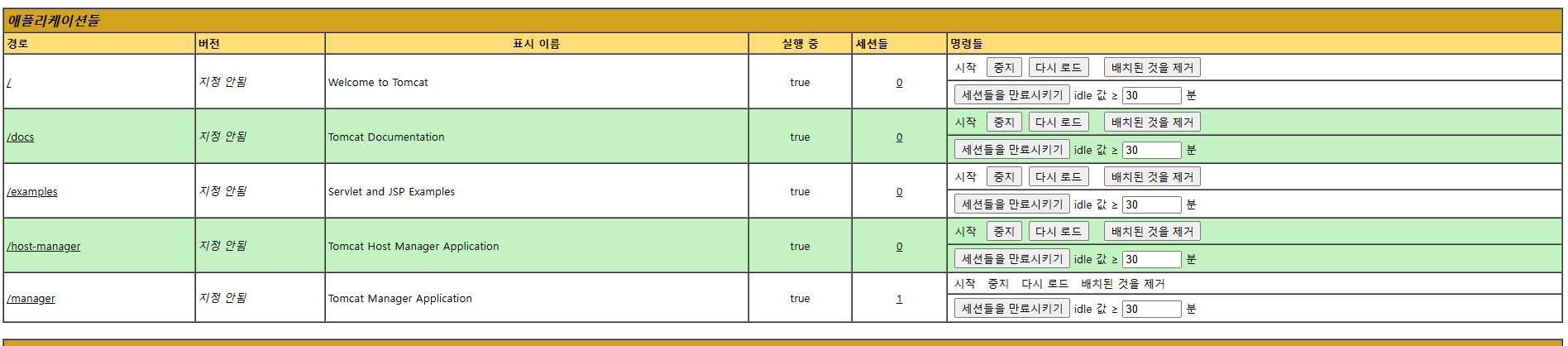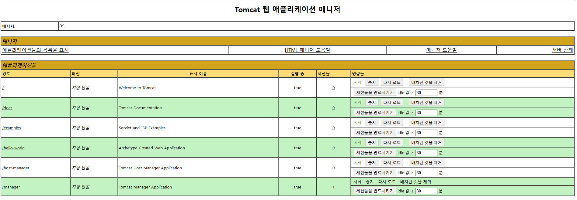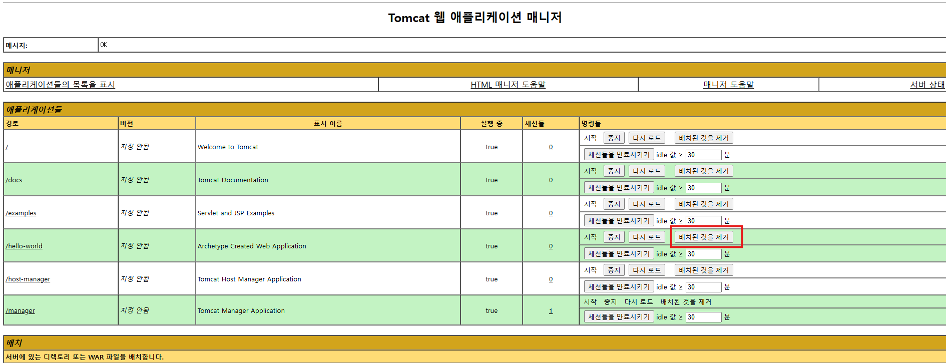 톰캣 실행 후, manager-gui 권한이 있는 tomcat으로 로그인해, helloworld 파일 지워보자