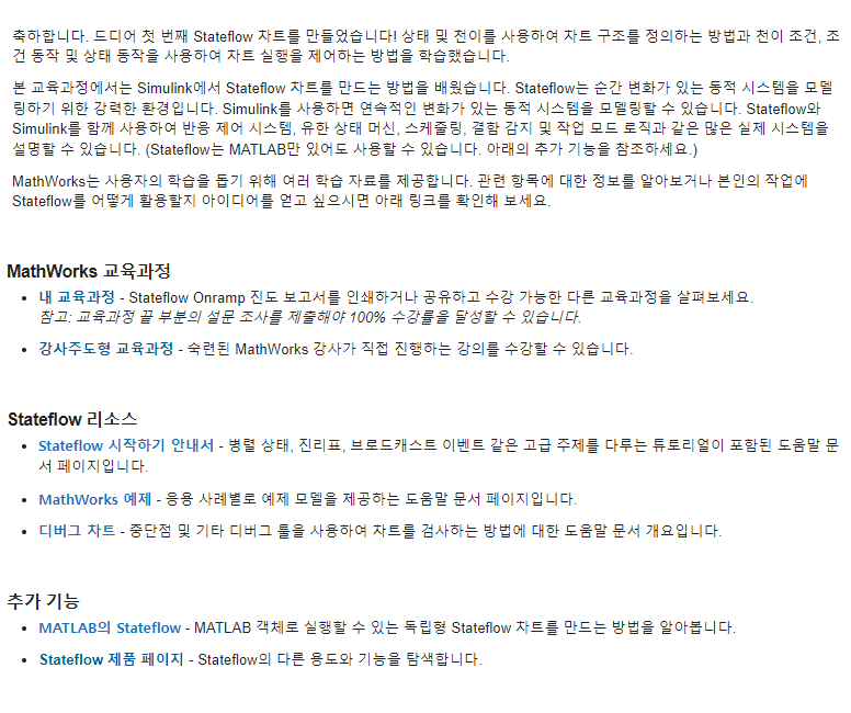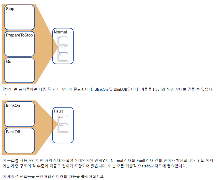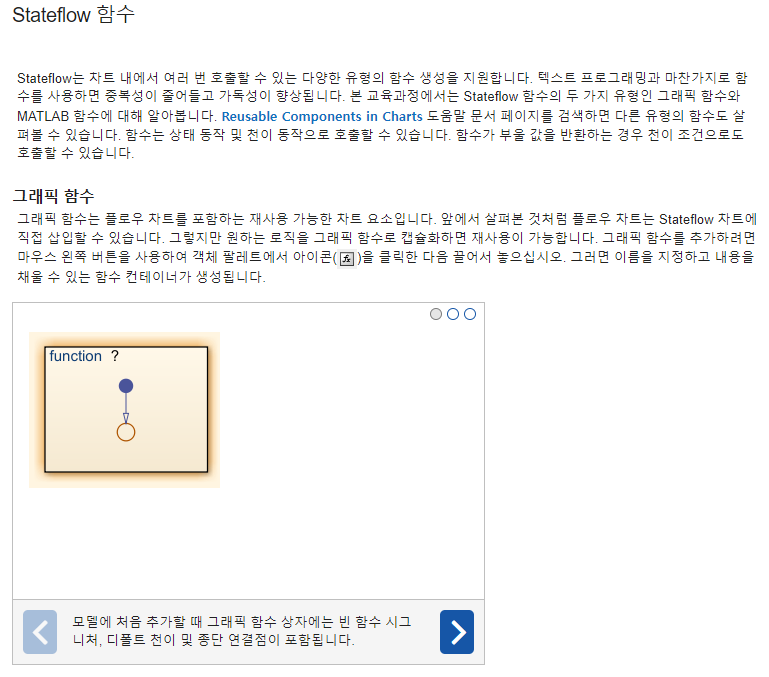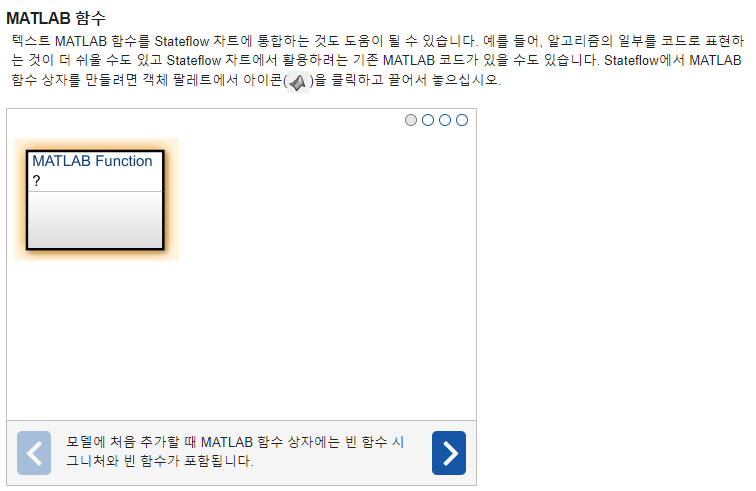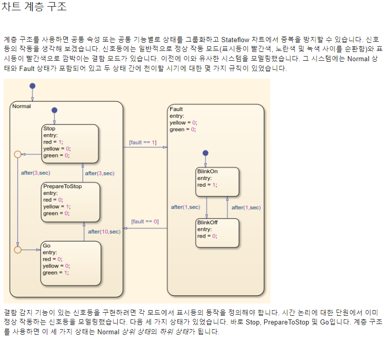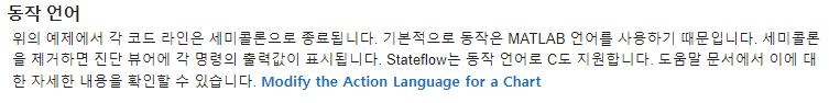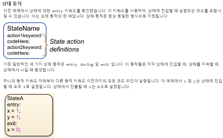 상태 동작 : 특정 상태가 활성 상태일 때 Stateflow가 수행하는 동작