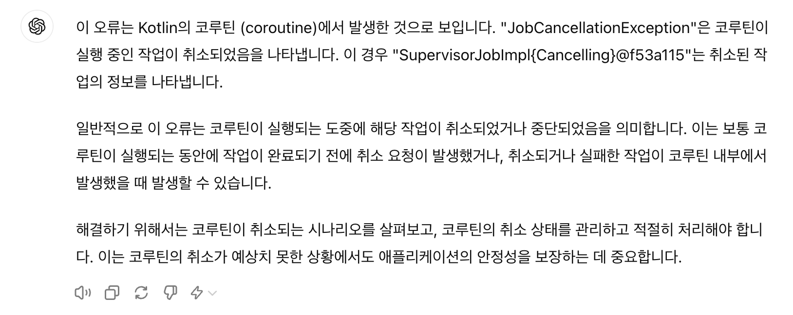 약 1시간의 삽질 끝에, SupervisorJob을 이용하여 생각보다 쉽게 해결하였다.