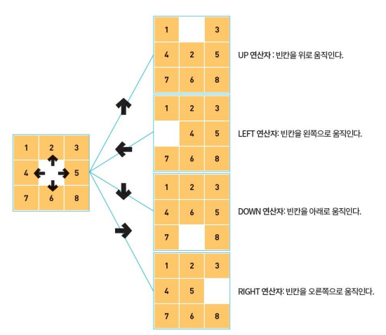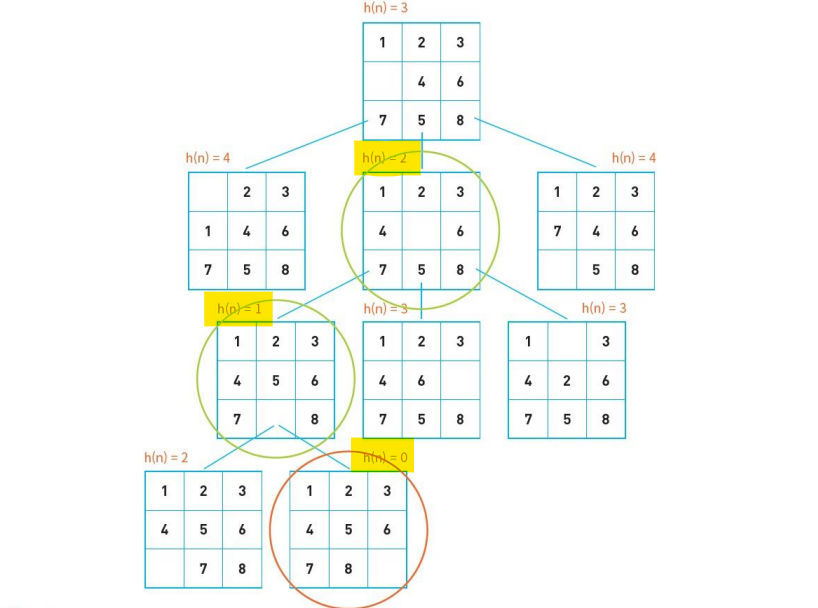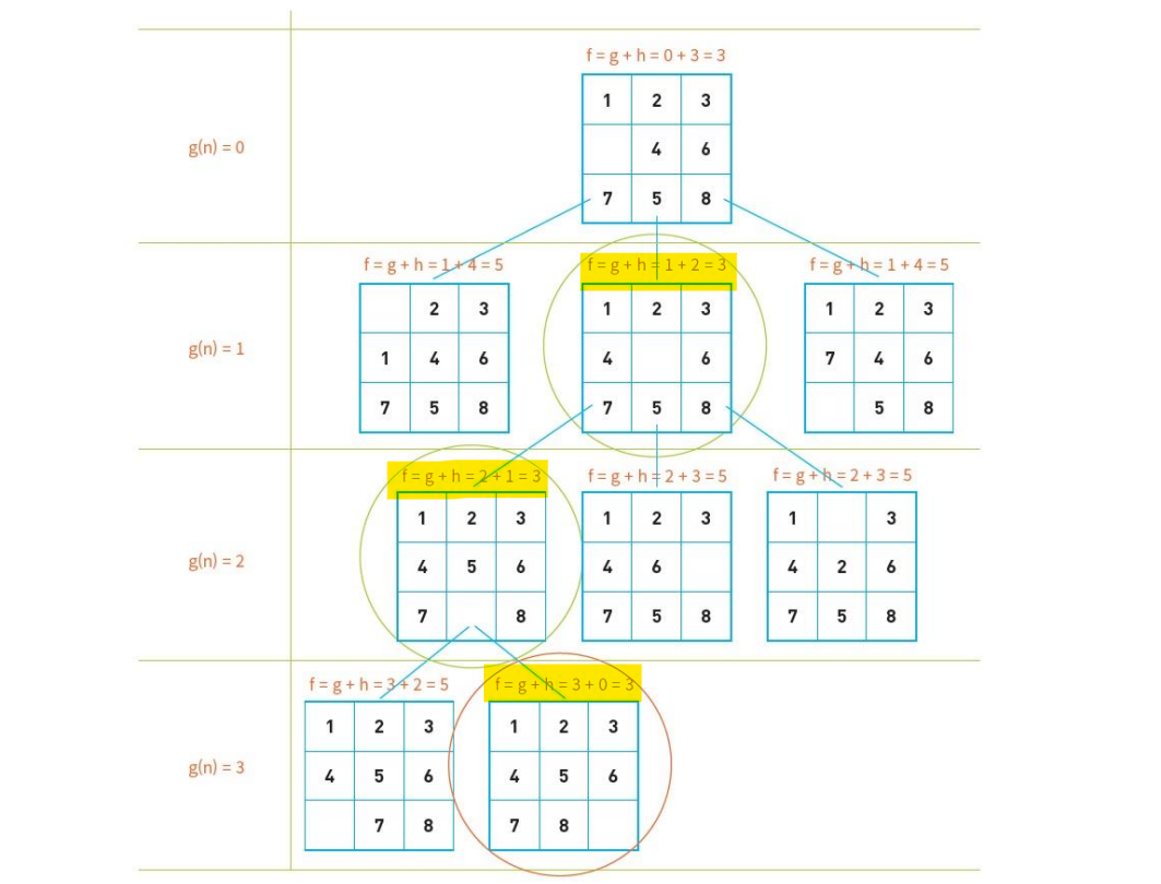 평가함수로는 을 사용하며, 제 위치에 있지 않은 타일의 수이다.