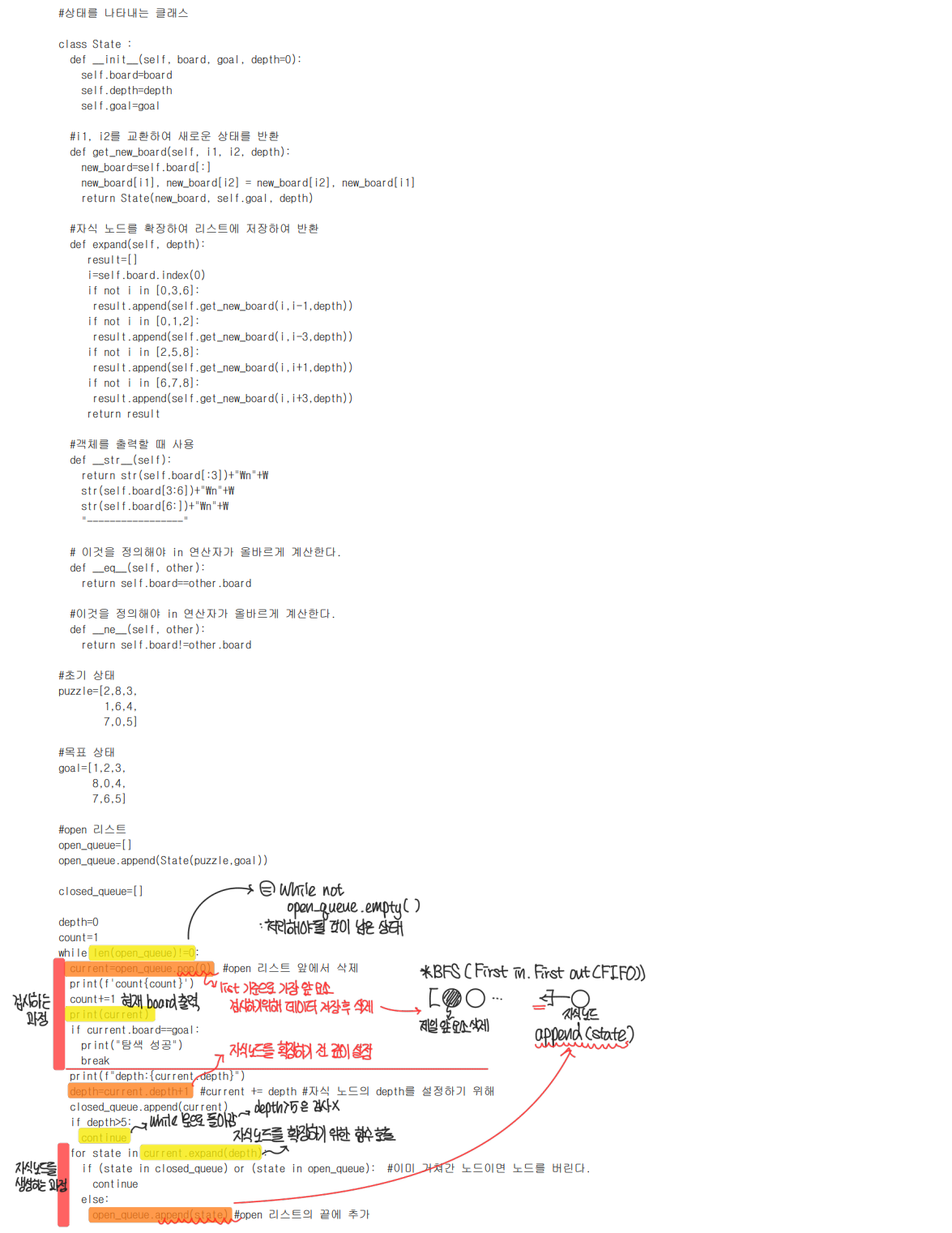 closed list를 작성할 때는 검사된 것을 추가하고, 순서는 그 코드에서 append()를 쓰면 뒤로, insert(0,state)를 쓰면 앞으로 작성하면 된다.