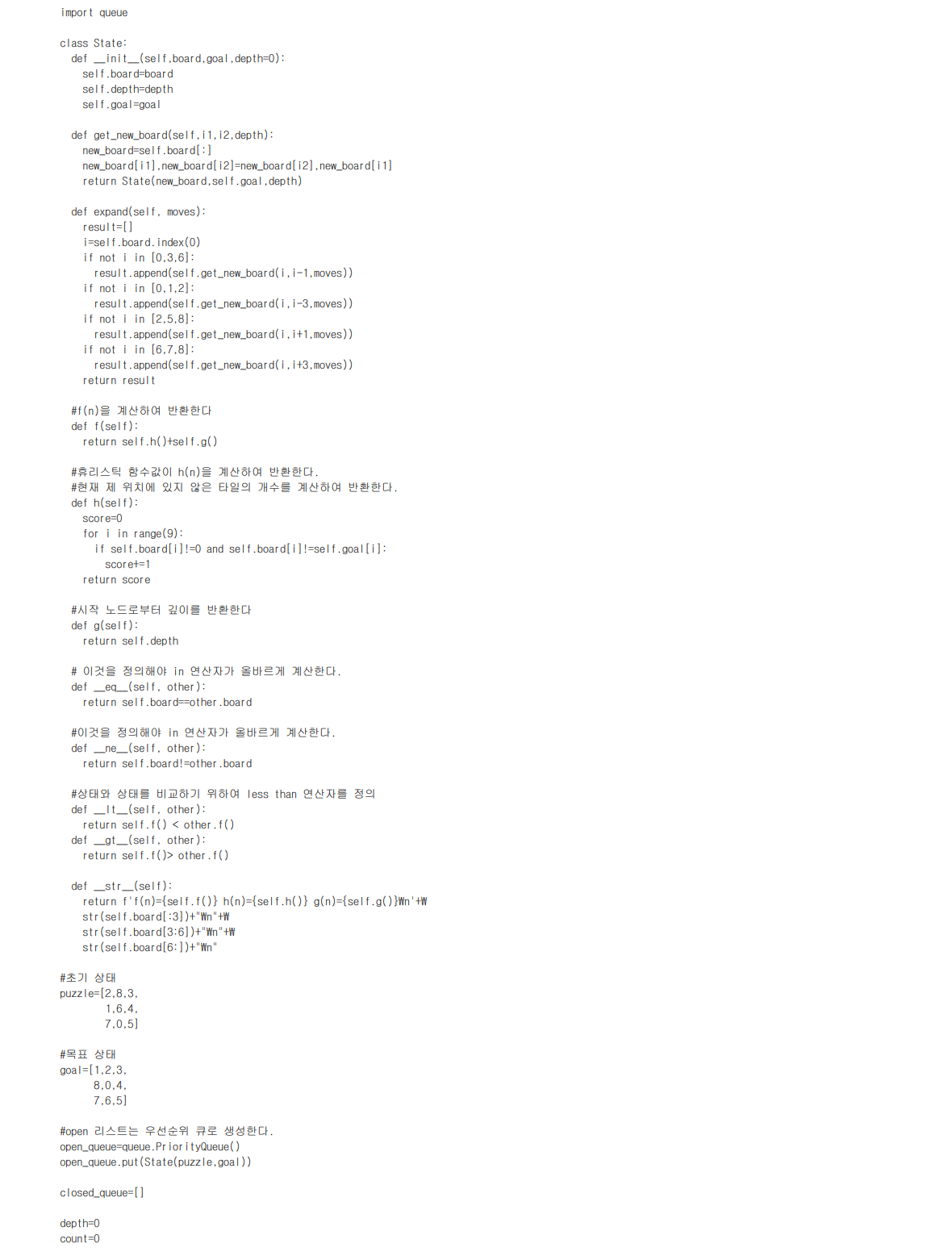 : 현재 노드에서 목표 노드까지의 추정 거리(목표 노드와 제 위치에 맞지 않는 타일의 수)